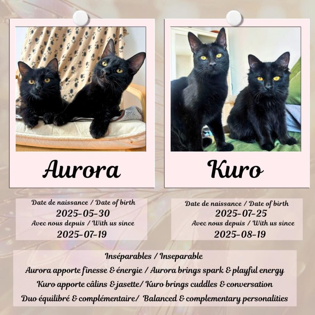 Aurora & Kuro, câest un mĂ©lange parfait dâĂ©nergie, de douceur et de conversations fĂ©lines animĂ©es đŸâš.