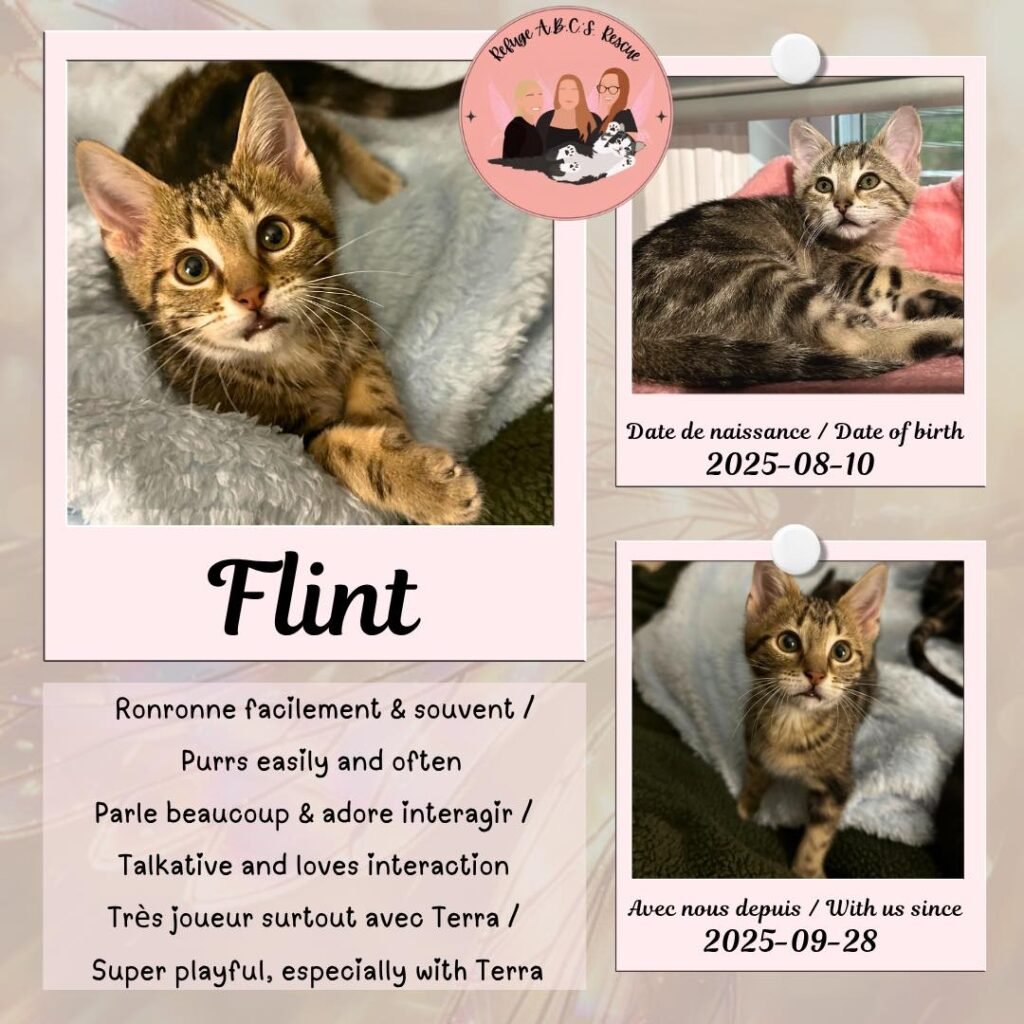 Flint est un chaton expressif, affectueux et plein d’énergie — un petit acrobate qui fera de chaque journée un spectacle de ronrons et de bonne humeur 💫🐱
