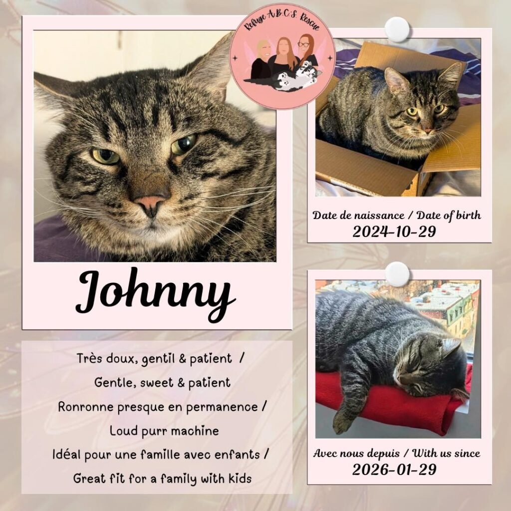 C’est un chat extrêmement gentil et affectueux, une vraie grosse patate sans aucune malice. Grâce à son tempérament doux et patient, Johnny serait parfait pour une famille avec des enfants qui veulent un compagnon câlin et facile à vivre.