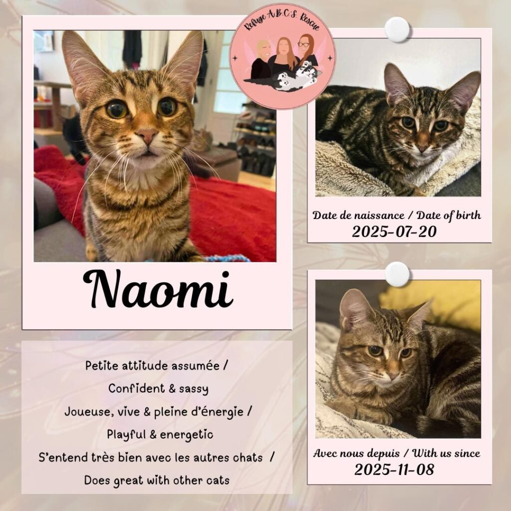 Sassée, joueuse et pleine de pep, Naomi est toujours partante pour transformer n’importe quoi en jeu 🎯. Elle adore les autres chats et serait super heureuse dans une maison où elle peut avoir des amis félins pour jouer — et accessoirement se faire admirer 😹🐱.